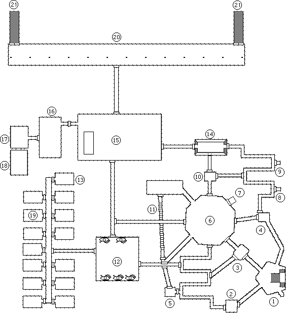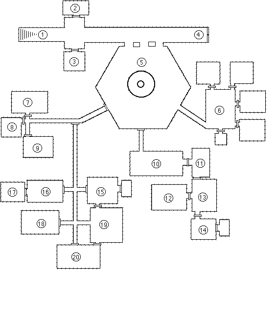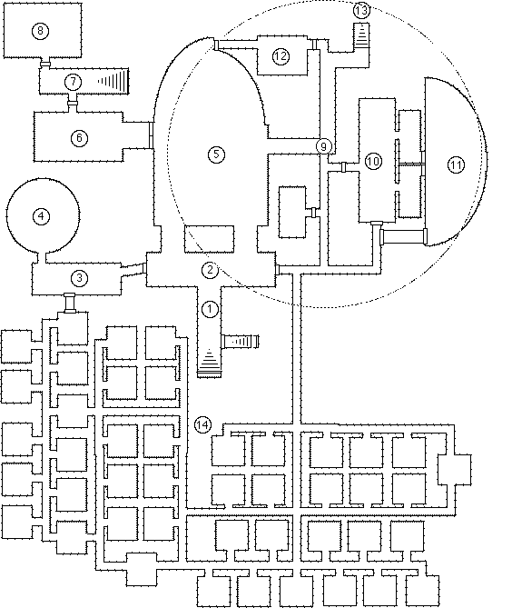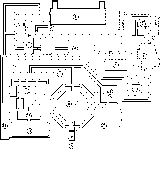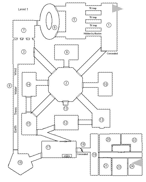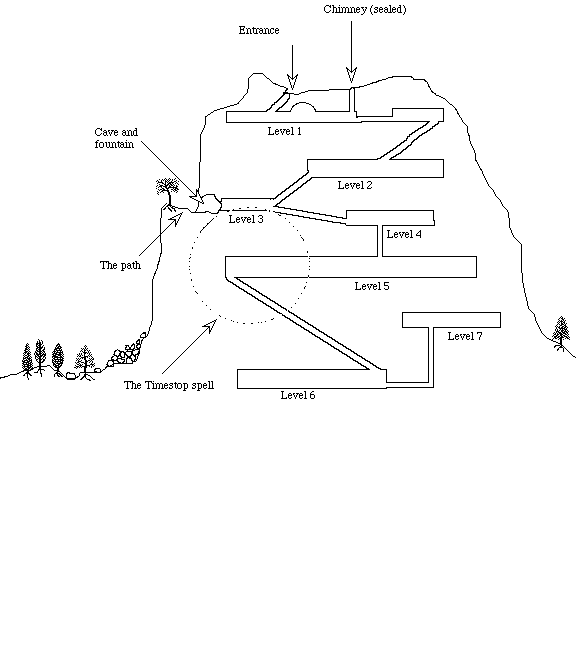 There are a number of ways that GMs can get their players involved in this adventure. The crag should seem like a safe refuge or a place to make a stand if they are travelling through the area and have problems with monsters or bandits. Once there they could notice the unnatural nature of the crag top and find the entrance by poking around (see level one) or the secret entrance in the cave halfway up (see level 3). An alert player will also notice the regular mounds among the trees that surround the crag - all that remains of the city that used to lie at the foot of the crag. Perhaps a few shaped stones are still visible. Normally, any sign of buried mysteries is enough to get players digging like rabbits . If that does not happen, don't force them - let them move on. It is fun to let them find the old map in a later adventure and realise that they have been to the site it depicts. If some legends of hidden wealth are associated with the map, that should motivate them.