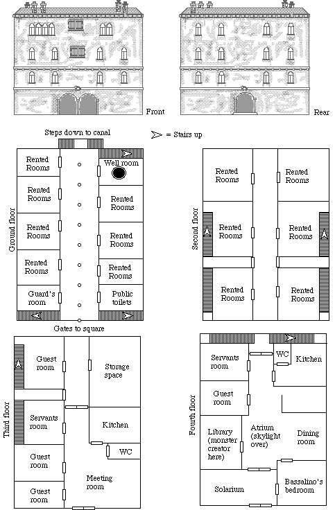 The exterior walls are thick stone (8 def, 11 body). The exterior gates are of iron (7 def, 5 body). Interior walls are lath and heavy plaster (4 def, 3 body), except those of the stairwells which are stone (7 def, 7 body). All doors are wood (4 def, 3 body). All ceilings are 4 M high. The windows are open, with wooden shutters (2 def, 3 body) - normally latched at night. The bulding is contiguous with (but 1 storey higher than) its neighbours on either side. It forms the end of a small plaza reached by a narrow alley (2M wide) from the street and backs onto a canal (5M wide). The building immediately facing across the canal are also 3 stories high.