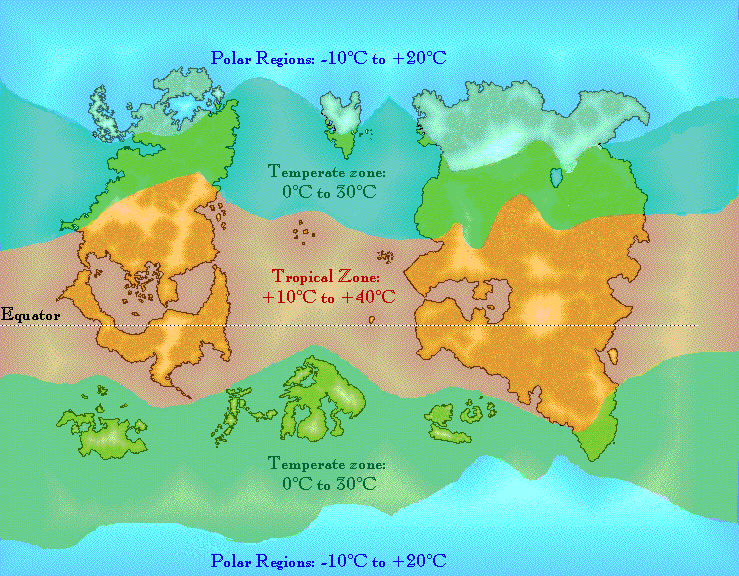 The map below shows typical daytime temperatures during summer and winter on Arth. These are of course broad generalisations - local conditions can cause great variation, and the weather itself can vary wildly. In general, however, it is fair to say that the climate of Arth is both warmer and more moderate than that of our own world - and the tropics tend to be significantly hotter than those of our world.