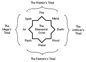 The 4 Inert Elements are Earth, Water, Air and Fire. They are regarded as primal forces created by the gods. The 4 Vital Elements are Flesh, Wood, Metal and Spirit and they are regarded as the work of will. Moreover, the elements are grouped in Triads - which are very important in spellcatsing (see below) but which are also considered symbolic of certain types of mentality or occupation - and thus of people or Aspects. These are shown to the left. |