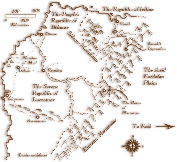 The Martic league consists of three republics - although it would be more accurate to call them city-states, since each is dominated by one large city. They are the Republic of Irilian, with a population of about 50,000 and an area of about 50,00 square kilometres, the People's Republic of Ilthmar with a population of about 400,000, and an area of approximately 90,000 square kilometres, and the Serene Republic of Lacramar, the largest and wealthiest of the three, with a population of approximately 1.5 million and an area a little over 80,000 square kilometres. While officially allied into the poltical entity called the Martic League by the Concordat of Sael, all three cities compete fiercely over trade, and this breaks out into covert warfare from time to time. The total population is about 10 milion, of which some 20% is urbanised. The bulk of the population live in small villages on the coastal plains around the major cities.
