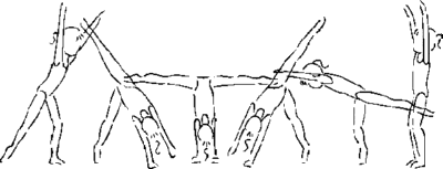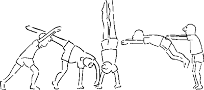 Lack of flexibility in the shoulders and reaching for the ground too soon.Back Handspring -Start with feet together and arms straight out in front of you. As you bend yur knees, act like you're sitting in a chair. Swing your arms down as you sit. Jump up and back as you swing your arms above your head to touch the ground. When you are in the handstand position, use your abdominal muscles to snap your feet down and rebound. If your whole squad has a standing back handspring, get into rows and do back handsprings together. Or you could all stand in a circle and do a back handspring out.