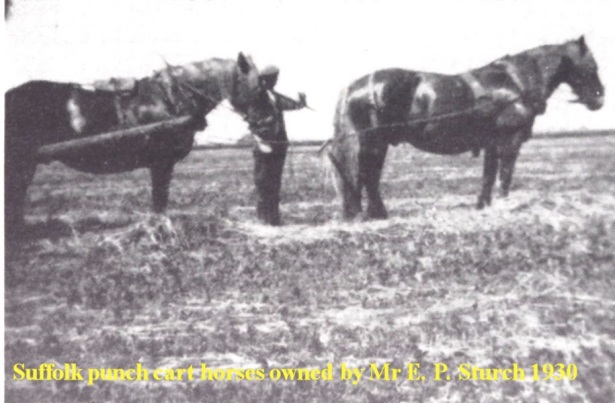 When Mr. Porter left in 1919, the farm was taken over for a few years by Mr. James Hollies. Mr. Sturch, who followed, had horses when he arrived in 1926, but he gradually went over to tractors and the stables were used for machinery. The farm is now run by his son, Perrin Sturch, with even fewer workmen, but he has modern equipment for cultivating his crops. In Mr. Porter’s time, the workmen gathered in front of the stables for their day's orders. The hours were 7 a.m. to 5 p.m. on weekdays and 4 p.m. on Saturdays. They were paid twelve to fifteen shillings a week according to grade, with extra for thatching, hoeing, sheep-shearing or hedgecutting. Money was never plentiful, but it seemed to be sufficient for people to live happy, contented lives.