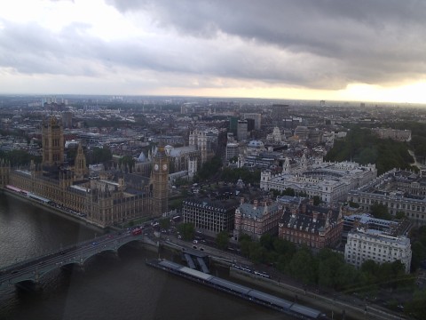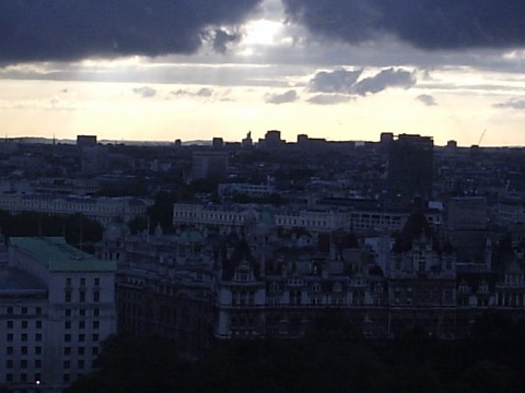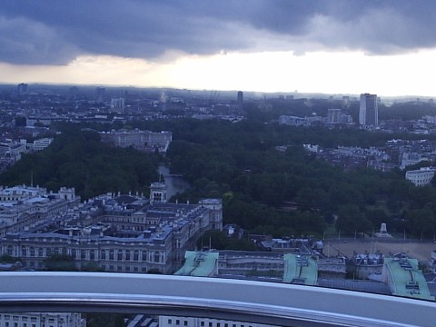 In the middle of this picture you can see Buckingham Palace and most of St James Park and its lake. The green to the right of Buckingham Palace is Green Park, and to the upper right of that is the corner of Hyde Park. In the foreground are some of the buildings of Whitehall, the political center, not far from No. 10 Downing Street.