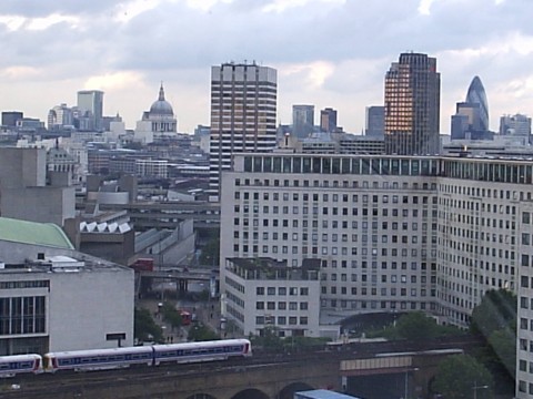 The area around Waterloo train station, a major connection point for the Central London. Straight to the back is St Paul's Cathedral and the buildings of the City.