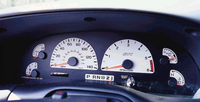 Ahhhhhhhh, what a cluster! Note the 140mph speedometer and in dash PSI/Boost guage; to keep an eye on the level of boost being produced by the Eaton Supercharger underhood.
