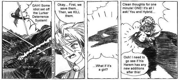This is just a little comic strip I happen to be doing in my spare time when I'm not working on the CL manga. It's based around the events and people of my message board at www.nyteskyy.com/phpBB2/ (Go check it out!). Back to Main page.
