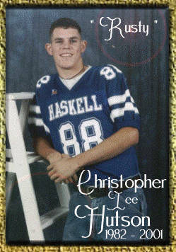 Christopher Hutson, 18 of Haskell, Oklahoma Died, Friday, January 26, 2001 in his home town. Services were held at 3:30pm Wednesday in the Haskell School Gymnasium with Rev. Charlie Jamison officiating. Interment was held in the Haskell Cemetery, under the direction of Dowdy's Funeral Home. Pallbearers were Ryan Bair, Robert Cheatham, Tony Cheatham, Mitch Daniels, Eric Brown, and Aaron Adams. Honorary pallbearers were Wesley Hutson, Briar Allen, Kenny Miller, Joe Walker and Dwayne Walker.