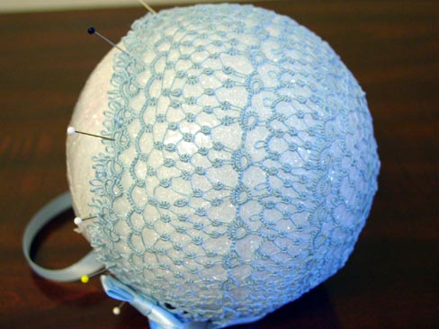 This tatted baby bonnet's pattern was found in Every Women's Complete Guide to Tatting. Brittany's bonnet. It is a needle tatting pattern. This one was done with shuttle. against a darker background