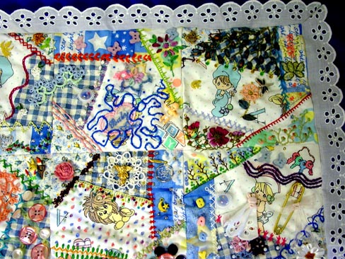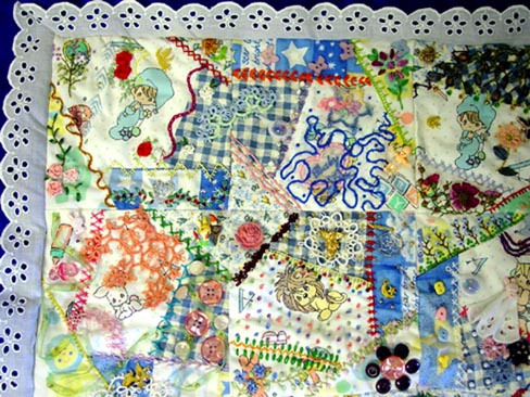 This is a crazy quilt my 8 year daughter and I made together for a baby shower. It is machine sewn by my daughter and embellished by me. The border material is from the bridesmaid dress I wore at the wedding. We added items from the babyshower and some of my tatting.
