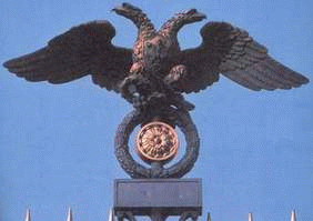 (These Rulers and their sons following them also rule the world under the Royal bloodline of Cain, of his DNA. Bas-relief of “Number Three King Asshur Nazir” with his two Eagle sons carry world scepters and Son-of-the-sun Orbs). They fight for their ‘divine right’ to rule. This has continued for 6000 years, and can be traced by following Cain’s Eagle God and Eagle Goddess they are under and worship. Eagle God used by Masons [See 32nd an 33rd. degree pins] is now again over Russia, and used by Albanian-Kosovo Moslems. “It” went back over Russia soon after Gore’s visit. If you read the history of this symbol, it cannot be used without a living God Tsar, as the Romanovs.