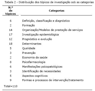 A idade dos participantes situou-se entre os 34 anos e os 71 anos (média=54.1 anos; D.P.=8.46), sendo a maioria do sexo masculino (73%;n=27). Relativamente à sua formação, 83.8% (n=31) eram especialistas em psiquiatria, 8.1% (n=3) em pedopsiquiatria, e 8.1% (n=3) em psiquiatria e pedopsiquiatria. Cerca de metade dos participantes tinha formação complementar (48.6%), dos quais 35.1% (n=13) tinham um doutoramento, 5.4% (n=2) tinham um mestrado, e 8.1% (n=3) tinham uma pós-graduação. Ao nível dos anos decorridos desde a conclusão da formação inicial registaram-se variações entre os 2 anos e os 37 anos (média=21.9 anos; D.P.=8.21). Relativamente ao cargo desempenhado na instituição à qual se encontravam afectos, 51.4% (n=19) eram Directores de Serviço/Departamento, 18.9% (n=7) eram Chefes de Serviço, 16.2% (n=6) eram Professores Universitários, e 13.5% (n=5) ocupavam outros cargos. Mais de metade (62.2%; n=23) exerciam funções de docência em estabelecimentos de ensino superior. Destes participantes 43.2% (n=16) exerciam essas funções de forma regular e 18.9% (n=7) de forma irregular. Todos os participantes (n=37) referiram ter artigos publicados em revistas da sua área de especialidade. Mais de metade (56.8%; n=21) referiu ainda já ter publicado de forma individual, ou em co-autoria, pelo menos um livro sobre a sua área de especialidade. 2.3. Procedimentos Solicitou-se aos membros do Painel, contactados via correio de superfície, que nos remetessem num prazo de 15 dias a sua resposta aos questionários que lhes foram enviados em cada uma das três voltas que compuseram este exercício Delphi. Para efeitos de resposta incluiu-se em anexo a essa documentação um envelope com franquia pré-paga. Esgotado o período de resposta inicialmente concedido enviou-se uma carta a todos os “não-respondentes” apelando à sua participação nessa volta. Um mês após o início de cada volta, os ainda não-respondentes foram contactados, via telefone, ou correio electrónico, e convidados a participar nessa volta até um prazo limite de duas a três semanas. Uma vez atingida essa data a volta era dada por encerrada sendo os não-respondentes excluídos da(s) volta(s) subsequente(s). Todos os peritos convidados a integrar o Painel foram informados através da documentação da 1ª volta que o teor das suas respostas, bem como os seus dados pessoais e profissionais, seriam mantidos sob anonimato. Optou-se no entanto por não assegurar o anonimato da identidade dos participantes essencialmente por dois motivos: 1) devido à necessidade de promover a “accountability” dos resultados (Goodman, 1987); e 2) por se ter fornecido de uma forma bastante detalhada os critérios de inclusão no Painel (como forma de incentivar os peritos convidados a participar no estudo), por exemplo, ser director de um serviço ou departamento de Psiquiatria e Saúde Mental de uma unidade de saúde do SNS, o que tornaria impossível impedir a identificação de vários dos peritos convidados. Deu-se início à 1ª volta através do envio de um convite a cada um dos peritos onde se expôs o âmbito e objectivos do estudo. Da documentação enviada nesta volta fazia ainda parte uma ficha com perguntas para caracterização sócio-profissional do participante, bem como o questionário da 1ª volta, questionário este que assumiu a forma de uma única questão nomeadamente: «Tendo como referência o cargo que ocupa, e as actividades que nesse âmbito desenvolve, indique até 4 tópicos de investigação na área da saúde mental que, pela sua importância, considere que deverá ser dada prioridade». De modo a “balizar” as respostas dos participantes, forneceu-se ao Painel uma definição dos conceitos de investigação (Office for Protection from Research Risks, citado por Snider, & Stroup, 1997, p.29) e de saúde mental (Lavikainen, J., Lahtinen, E., & Lehtinen, V., 2000, pp. 15-16). Foram recebidos, dos 37 peritos que aceitaram participar na 1ª volta, um total de 137 tópicos de investigação. Uma vez dada por concluída esta volta todos esses tópicos foram alvo de uma tentativa de síntese em que se procurou, sempre que possível, abreviar a sua redacção, e agregar tópicos idênticos, ou muito similares sob uma única redacção. Este esforço de síntese, que resultou numa redução a 110 tópicos, foi acompanhado de uma tentativa deliberada para que os tópicos sofressem o mínimo de alterações ao nível da linguagem utilizada na sua redacção original. Seguidamente os tópicos foram agrupados em várias categorias tendo em vista potenciar a comparação entre tópicos de uma mesma área de investigação, bem como entre tópicos de diferentes áreas. Na Tabela 2, encontram-se expostas as 14 categorias criadas para esse efeito. A ordem de apresentação destas categorias, bem como a ordem de apresentação dos tópicos, foram definidas através do recurso a uma tabela de números aleatórios.