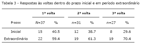 Na 2ª volta solicitou-se a todos os membros do Painel que participaram na 1ª volta para que através do recurso a uma escala ordinal (tipo Likert) de 5 pontos atribuíssem a cada um dos 110 tópicos de investigação o grau de prioridade (nomeadamente: 1- nada prioritário; 2- pouco prioritário; 3- prioritário; 4- muito prioritário; 5- extremamente prioritário) que na sua opinião consideravam que esse deveria ter no âmbito de uma (futura) Agenda de Investigação em Saúde Mental em Portugal. Apelou-se aos membros do Painel para que aquando das suas apreciações tivessem presente nas suas escolhas, entre outros factores que considerassem pertinentes, o potencial nelas contido para afectar positivamente os cuidados e o bem-estar dos utentes dos serviços de saúde mental e ainda a capacidade de maximização dos recursos disponíveis. Adicionalmente convidou-se os membros do Painel a fundamentarem o grau de prioridade atribuído a qualquer um dos tópicos de investigação, ou a tecerem qualquer outro comentário que entendessem sobre a lista de tópicos no seu conjunto. Com a 3ª volta pretendia-se confrontar os membros do Painel com o resultado da apreciação colectiva a cada um dos tópicos de investigação. Para este efeito enviou-se a todos os peritos que participaram na 2ª volta uma versão individualizada da lista dos tópicos de investigação. Nessa versão criou-se um espaço à frente de cada um dos 110 tópicos onde se inseriu o valor da apreciação indicada na volta anterior pelo participante em causa, bem como o resultado da apreciação colectiva do Painel em termos da sua tendência central (medianas) e dispersão (intervalo inter-quartis: 1º quartil; e 3º quartil). Forneceu-se ainda ao Painel uma definição, e ilustração, dos conceitos de mediana e de intervalo inter-quartis, bem como para efeitos de consulta, os comentários escritos que os participantes da volta anterior efectuaram aquando da apreciação a alguns dos tópicos de investigação. Colocados perante esses dados solicitou-se-lhes que revissem, sempre que assim o entendessem, cada uma das suas anteriores apreciações. Solicitou-se-lhes ainda que aquando da revisão às suas apreciações iniciais, sempre que entendessem mudar ou manter uma dada apreciação, verificassem se essa se situava fora do intervalo interquartis. Caso tal se registasse convidava-se o participante a explicitar o motivo subjacente a essa mudança ou manutenção. Em qualquer outra situação convidava-se ainda adicionalmente os membros do Painel, a sempre que assim entendessem, a adoptar o mesmo procedimento. Entre o envio da documentação da 1ª volta (2ª semana de Fevereiro de 2003) e o encerramento da 3ª volta (2ª semana de Novembro de 2003) decorreram 40 semanas. A taxa de resposta em cada uma das três voltas foi respectivamente de 48.1% na 1ª volta, 83.8% na 2ª volta, e 87.1% na 3ª volta. Mais de metade das respostas foram recebidas fora do prazo inicialmente estipulado (Tabela 3).