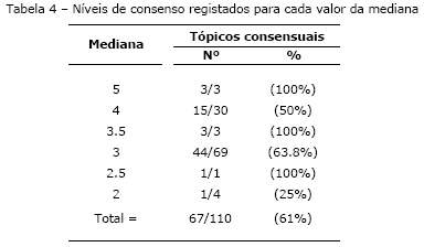Previamente ao início de cada uma das três voltas procedeu-se, em termos de pré-teste, a várias diligências tendo em vista averiguar a compreensão e adequação das questões colocadas, das instruções de preenchimento e de outros aspectos de ordem metodológica. Em linha com os estudos de James, Aitken, & Burns (2002), Fiander & Burns (1998) e Raskin (1994), estabeleceu-se como condição de consenso, a verificação que a amplitude interquartil de um dado tópico de investigação fosse menor ou igual a 1,00. De forma adicional, atribuiu-se a designação de “prioridade de investigação consensual” a todos os tópicos em que se registasse um consenso e em que a mediana fosse igual ou superior a 4,00. Na análise estatística utilizou-se o programa informático SPSS (versão 9.0.0). As conclusões foram tiradas a um nível de significância de p £ 0,05. Em virtude da natureza qualitativa das variáveis em estudo recorreu-se à utilização de testes não-paramétricos nomeadamente aos Testes de Wilcoxon, de Mann-Whitney e de Kruskall-Wallis. De forma suplementar à descrição dos resultados destes testes recorremos, a título de ilustração, à apresentação dos argumentos utilizados por alguns membros do Painel para fundamentar o grau de prioridade atribuído a alguns tópicos de investigação. 3. RESULTADOS Face à definição de consenso adoptada foi identificada a presença de consenso em 67 tópicos de investigação distribuídos por diferentes graus de prioridade (Tabela 4). Destes 67 tópicos, 18 preencheram os requisitos estabelecidos para classificação enquanto “prioridade de investigação consensual” (Tabela 5).