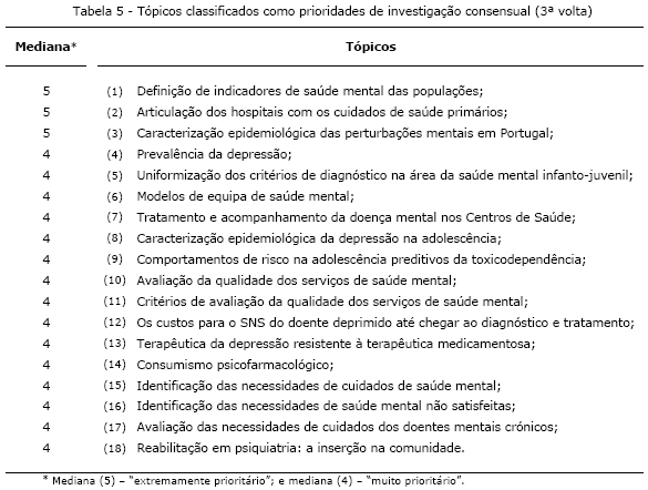 Resumo Identificaram-se, através do recurso à aplicação da técnica do Painel Delphi, prioridades de investigação consensual em saúde mental em Portugal junto de psiquiatras e pedopsiquiatras de todos os Distritos de Portugal Continental. Solicitou-se-lhes que indicassem até quatro tópicos para investigação que na sua opinião deveriam ser considerados como prioritários. Dos 77 profissionais de saúde convidados, cerca de 37 aceitaram participar na primeira das três voltas. Após a conclusão da 3ª volta identificou-se, distribuídos por diferentes graus de prioridade, a presença de um consenso em 67 tópicos de investigação. Entre estes, 18 tópicos foram classificados como “prioridades de investigação consensual” que, na sua maioria, se situaram ao nível das categorias da «investigação epidemiológica», da «identificação de necessidades» e da «organização e prestação de cuidados». Os resultados obtidos suscitam vários questões que carecem de uma discussão e aprofundamento adicional. No âmbito da organização de uma agenda de investigação em saúde mental esta discussão deverá ser alargada a outras classes de profissionais de saúde, bem como aos utilizadores dos serviços de saúde mental, e seus familiares, de forma a averiguar a convergência e/ou divergência de perspectivas. Palavras-chave: consenso; Delphi; pedopsiquiatria; prioridades de investigação; psiquiatria; saúde mental. Abstract Mental health research priorities in Portugal: Perspectives from a Delphi panel of psychiatrists and child and adolescent psychiatrists The research identifies, through the use of the Delphi technique, consensual mental health research priorities in Portugal in a sample of psychiatrists and child and adolescent psychiatrists. We asked our panel of experts to point out four topics that in their opinion should be considered as research priorities. From the 77 experts invited, 37 experts accepted to participate in the first of the three rounds. After the conclusion of the third round we identify, distributed by different levels of priority, the presence of a consensus in 67 research topics. Between those, 18 topics were classified as “consensual research priorities” which in it's majority could be placed in research categories of «epidemiology», «needs assessment» and «care delivery and organization». The results raised several questions that need a deepening and additional discussion. In the context of the development of a mental health research agenda, that discussion should be extended to other classes of health professionals, as well as mental health consumers and their families, to assess the convergence and/or divergence of perspectives. Key words: consensus; Delphi; child and adolescent psychiatry; psychiatry; research priorities; mental health. 1. INTRODUÇÃO Num momento em que se assiste a um crescente reconhecimento do papel central da saúde mental, para a saúde e bem-estar em geral, o aumento previsível do número de pessoas afectadas por distúrbios neuropsiquiátricos coloca os sistemas de saúde, e este campo da saúde em particular, perante um novo desafio. A Organização Mundial de Saúde (OMS) em 2001 no seu relatório anual sobre a saúde mundial - nesse ano dedicado à saúde mental - fazia previsões de que uma pessoa em cada quatro viesse a ser afectada por distúrbios neuropsiquiátricos em alguma fase da sua vida (WHO, 2001). Apesar de várias projecções que apontam para uma deterioração da saúde mental da população mundial, este campo da saúde continua a não ser considerado com a mesma importância que a “saúde física”, sendo em larga medida secundarizado ou ignorado. Tendo em consideração a magnitude desta problemática e a natureza multifacetada das suas causas, a OMS recomendava nesse ano a adopção, com carácter de urgência, de várias medidas. Uma dessas recomendações apelava ao reforço do papel da investigação enquanto meio não só para aprofundar o conhecimento sobre esta problemática, mas também para apoiar a definição de prioridades, o planeamento e a avaliação de vários tipos de intervenções. O contributo da investigação e desenvolvimento (I&D) a este nível tem estado no entanto sujeito a vários constrangimentos, nem sempre perceptíveis pelo público em geral, nomeadamente situações de financiamento deficitário e alguma incapacidade em assegurar que os resultados dos esforços de investigação tenham um maior impacto nos problemas de saúde da população (Global Forum for Health Research, 2002). O problema da afectação de recursos para a investigação, ilustrado de uma forma clara aquando da apresentação na 15ª Conferência Nobel do relatório da Comissão sobre Investigação em Saúde para o Desenvolvimento, onde se estimava que somente cerca de 10%, ou menos, do financiamento mundial para I&D estaria afecto a doenças responsáveis por cerca de 90% do peso global da doença (USA. Commission on Health Research for Development, 1990; Switzerland. Task Force on Health Research for Development, 1991), mantêm-se praticamente na mesma (Global Forum for Health Research, 2001). A manutenção deste desequilíbrio, desde então conhecido sob a designação de «hiato 10/90», segundo o Fórum Global para a Investigação em Saúde (adiante designado por Fórum Global) pode-se situar, entre vários aspectos, ao nível das decisões de financiamento que nem sempre se apoiam em processos devidamente fundamentados e explícitos de identificação de prioridades o que tem conduzido a que muitas vezes essas decisões não correspondam às reais necessidades de saúde da população mundial (Global Forum for Health Research, 1999). No campo da saúde mental o financiamento da I&D reveste-se de particularidades adicionais, muitas delas assentes em séculos de luta contra a estigmatização que lhe tem sido tradicionalmente associada. Uma dessas particularidades situ