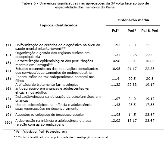 Entre as apreciações da 2ª e da 3ª volta encontrámos diferenças significativas quanto ao grau de prioridade atribuído a dois tópicos de investigação (Teste de Wilcoxon), nomeadamente: “Modelos e estruturas de apoio na comunidade ao doente com esquizofrenia” (Z= -2.236; p=0.025); e “Separações maritais ou divórcios devido ao álcool” (Z= -2.000; p=0.046). De referir, no entanto, que dos membros do Painel que se pronunciaram sobre estes dois tópicos, 25 no primeiro, e 26 no segundo, respectivamente 20 e 22 participantes não alteraram a sua apreciação na 3ª volta. Todas as mudanças de apreciação tenderam para a atribuição de um grau de prioridade mais elevado. Cerca de 37.0% (n=10) dos participantes não procedeu a nenhuma alteração. Junto dos restantes participantes (n=17) registámos algumas variações acentuadas, nomeadamente entre participantes que alteraram duas apreciações e um outro que procedeu a 61 alterações (média=21.76; D.P.=17.51). Este último participante, conjuntamente com um outro que alterou 47 das suas apreciações iniciais, reapreciações estas que tenderam todas para o interior do intervalo inter-quartis, preconizaram as mudanças de opinião mais acentuadas. Nenhum desses dois participantes fundamentou alguma dessas mudanças, nem a manutenção de outras apreciações. A comparação das apreciações da 3ª volta face ao tipo de especialidade dos membros do Painel (i.e., psiquiatra, pedopsiquiatra, ou psiquiatra e pedopsiquiatra) permitiu encontrar diferenças significativas em 10 tópicos (Teste de Kruskall-Wallis; Tabela 6), nomeadamente: (1) “Uniformização de critérios de diagnóstico na área da saúde mental infanto-juvenil” (c2k=7.184; p=0.028); (2) “Organização e gestão dos registos clínicos em pedopsiquiatria” (c2k=10.755; p=0.005); (3) “Caracterização epidemiológica das perturbações mentais em Portugal” (c2k=7.588; p=0.023); (4) “Estudos catamnésicos das populações consultantes dos serviços/departamentos de pedopsiquiatria” (c2k=11.287; p=0.004); (5) “Repercussões da toxicodependência parental nos filhos” (c2k=7.046; p=0.030); (6) “A eficácia do tratamento farmacológico antidepressivo em crianças e adolescentes vs eficácia nos adultos” (c2k=8.695; p=0.013); (7) “Indicação/eficácia da utilização de psicofarmácos em crianças” (c2k=10.042; p=0.007); (8) “Uso de psicotrópicos na infância e adolescência – suas repercussões no desenvolvimento” (c2k=8.553; p=0.014); (9) “Aspectos psicológicos do insucesso escolar” (c2k=7.426; p=0.024); e (10) “A depressão na infância e adolescência e a sua relação com as aprendizagens” (c2k=8.132; p=0.017).