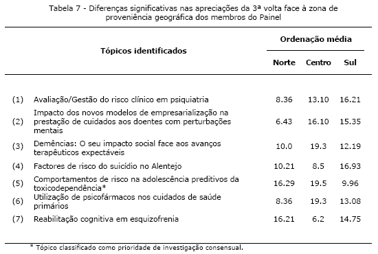 Estes dados permitem constatar que os participantes com as duas especialidades (psiquiatria e pedopsiquiatria) atribuíram um grau de prioridade mais elevado a quase todos os tópicos relacionados com temas de investigação da área da saúde mental infanto-juvenil. Nos restantes tópicos desta área foram os participantes com a especialidade de pedopsiquiatria que lhe atribuíram um maior grau de prioridade. No único dos tópicos em que foram os psiquiatras a atribuir um maior grau de prioridade, i.e., o tópico “Caracterização epidemiológica das perturbações mentais em Portugal”, constata-se que a ordenação média registada junto dos pedopsiquiatras assumiu, em termos comparativos com as dos outros dois grupos de participantes, um valor muito baixo. A comparação das apreciações da 3ª volta face à zona de proveniência geográfica dos peritos (i.e., Norte, Centro ou Sul) permitiu encontrar diferenças significativas em sete tópicos (Teste de Kruskall-Wallis; Tabela 7), nomeadamente: (1) “Avaliação/Gestão do risco clínico em psiquiatria” (c2k=6.209; p=0.045); (2) “Impacto dos novos modelos de empresarialização na prestação de cuidados aos doentes com perturbações mentais” (c2k=8.272; p=0.016); (3) “Demências: O seu impacto social face aos avanços terapêuticos expectáveis (c2k=6.024; p=0.049); (4) “Factores de risco do suicídio no Alentejo” (c2k=6.544; p=0.038); (5) “Comportamentos de risco na adolescência preditivos da toxicodependência” (c2k=7.718; p=0.021); (6) “Utilização de psicofármacos nos cuidados de saúde primários” (c2k=7.122; p=0.028); e (7) “Reabilitação cognitiva em esquizofrenia” (c2k=6.539; p=0.038).