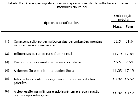 Numa análise às apreciações da 3ª volta face ao género dos membros do Painel encontrou-se diferenças significativas em seis tópicos (Teste de Mann-Whitney; Tabela 8), nomeadamente: (1) “Caracterização epidemiológica das perturbações mentais na infância e adolescência” (Z= -2.453; p=0.014); (2) “Influências culturais na saúde mental” (Z= -2.078; p=0.038); (3) “Psiconeuroendocrinologia na área do stress” (Z= -2.585; p=0.010); (4) “A depressão e suicídio na adolescência” (Z= -2.057; p=0.040); (5) “Inter-relação entre doença física e processos do foro psíquico” (Z= -2.004; p=0.045); e (6) “A depressão na infância e adolescência e a sua relação com as aprendizagens” (Z= -2.145; p=0.032). Constatou-se que, à excepção do tópico (3) “Psiconeuroendocrinologia na área do stress”, os valores das ordenações médias mais elevadas situam-se todos junto aos membros do Painel do sexo feminino. Constatámos ainda que três desses tópicos referem-se a temas de investigação na área da saúde mental infanto-juvenil.