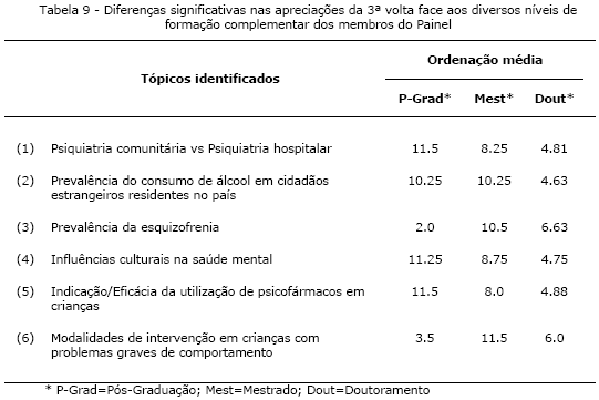 A comparação das apreciações dos membros do Painel com formação complementar face ao seus diversos níveis de formação complementar permitiu encontrar diferenças significativas em seis tópicos (Teste de Kruskall-Wallis; Tabela 9), nomeadamente: (1) “Psiquiatria comunitária vs Psiquiatria hospitalar” (c2k=6.313; p=0.043); (2) “Prevalência do consumo de álcool em cidadãos estrangeiros residentes no país” (c2k=7.139; p=0.028); (3) “Prevalência da esquizofrenia” (c2k=5.984; p=0.05); (4) “Influências culturais na saúde mental” (c2k=6.880; p=0.032); (5) Indicação/Eficácia da utilização de psicofármacos em crianças (c2k=6.375; p=0.041); e (6) “Modalidades de intervenção em crianças com problemas graves de comportamento” (c2k=6.210; p=0.045). À excepção do tópico (3) “Prevalência da esquizofrenia” constata-se que os membros do Painel com um doutoramento atribuíram um grau de prioridade mais baixo a todos os outros tópicos.