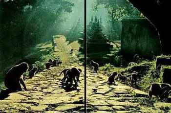 stel oeroude tempels die door uitgebreide apenfamilies gekoloniseerd zijn. De