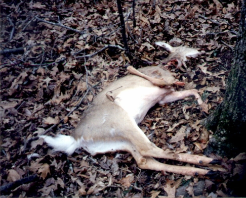 This is a Bigfoot deer kill we found on Jan. 6th, 2000. When we first found this deer it had a slit where the neck joins the body big enough for a large hand to fit. When we first found the deer the hole was smaller than in the photo as our dogs had eaten a small portion before we could get back to it with a camera (when we would leave the carcass, so would our dogs) The deer was intact with the exception of the liver which had been removed. The blood was still inside the body and did not spill until our dogs started eating on the carcass. Notice the tail on this deer is still flagged after it had been dead for quite some time. This tells us that this deer died in terrible fright. The front leg is broken and the deer is laying exactly like we found it.