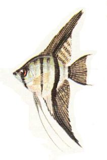 ANGELFISH - PTEROPHYLLUM SCALARE. NATURAL HABITAT: Amazon River, South America. SIZE:Angel fish can grow to be 6" long. COLOUR: The Angelfish comes in many varieties like Silver where it is obviosly silver and has stripes down its sides which darken/lighten with their emotions. SHAPE: A very unique vertical shape in which the fins flow backwards as extensions of the body. TEMPERAMENT: Peaceful, males especially can be very territorial. CARE: Feed with cut up earthworms and other live foods. Do not keep with fish as small as male Guppies and Neon Tetras as they wiil be eaten by your Angelfish. To get good looking Angelfish that have a tall Dorsal fin, keep them in a tall tank. WATER CONDITIONS: pH 6.5 - 7.0 and the temperature should be about 26 - 30*C. ( 78 - 84*F) GENDER: It is virtually impossible to tell. Older males can have a bump on their head. BREEDING: To breed use a neutral pH of 7.0 and a temperature of 28-30°C. The eggs are laid on rocks at a slant of 45 degrees, or rarely the front glass. Once Angelfish have paired - off, they are very easy to breed. COMMENTS ON THE ANGELFISH: Angelfish are very unique fish, they are tall and skinny and can balance very well. They are by far one of my favourite fish and are very popular. If you have any infomation or comments on this fish please mail it to me through the feedback located on the homepage.
