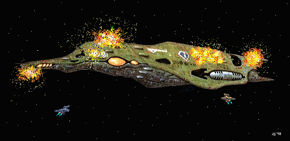 Una mirada al centro de mi pantalla EFIS me mostró una vista aumentada del crucero que se encuentra delante de mí. Un toque en el pedal de timón derecho llevó mi rifle a apuntar sobre una fila de sensores y antenas en la giba dorsal delantera. Presionando con mi pulgar el botón sobre la palanca libere una ráfaga de balas de 55 mm hacia la nave alienígena. Libere suavemente la palanca hacia atrás y barrí mi ráfaga de disparos a lo largo de la parte trasera de la nave enemiga verde oscuro. Los sensores se desintegraron en una nube de acero y blindaje que estallo del crucero, rasgando la red de sensores en trizas. Mientras miraba sobre la parte superior de la nave, esquive la joroba por unas cuantas pulgadas mientras los destrozos del crucero rebotaban de la nariz de mi caza.
