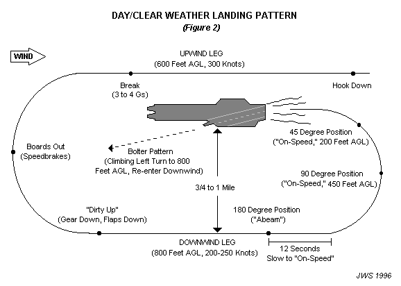 Jale los propulsores a punto muerto y suavemente baje la nariz antes de dirigirme hacia la nave. Estaba a dos millas de popa y descendiendo a 420 nudos cuando alcance la APT (Altitud del patrón de Trafico) de 800 pies. La nave gris y negra aparecía en frente de mí, justo a la izquierda de mi nariz. Me había colocado en el lado contra viento, a casi un octavo de milla a la derecha del portaaviones, colocado detrás de los otros jets en el patrón con 090 grados de dirección. Presione los propulsores al setenta y cinco por ciento y pase rápidamente sobre el bote gigante -mirando rápidamente mientras rugía a través- esperando hasta que el avión que seguía paso mi "línea Tres-Nueve" antes de empezar mi descenso. Con los propulsores otra vez en punto muerto, jale cuatro G en el quiebre y entre a favor de viento, dirigido a 260 grados, con las alas abiertas buscando que el indicador de velocidad marque 200 nudos. Un acercamiento estabilizado produce un buen aterrizaje.