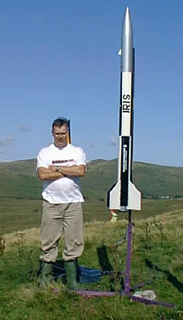 I launched my IRIS on a K550W. This had flown well at UKRA2001 recently. The sky today would hopefully give a better view of the flight. The camera and video were switched on and the rocket roared off the pad. The rocket did weather cock a little before deployment. The drogue ripped and the main had come out at apogee also, but the rocket was fine. You could hear and see the main deployment charges go at 400 feet, minus the main chute! The IRIS came down only a few hundred yards away. No damage sustained, except the damages drouge. I need to have the nose fixed tighter also!