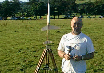 Another onne of Marks flights was with his Vaun Brothers EX-18 2-stage rocket with a B6-0 booster staging to a A8-5. The rocket boosted fine but failed to stage slight damage to fuselage/nosecone interface but otherwise ok.