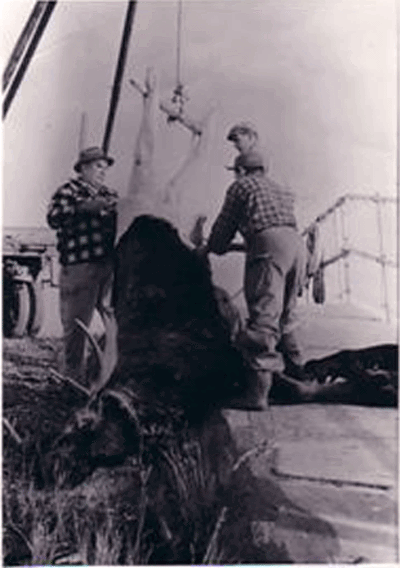 Frank Longford, Andy Ingard, and Tommy Iserhoff Skinning a Moose on the Dam, circa. 1961