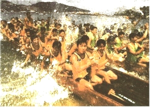 Splash landing Competitors from the HK Sea School (front) arrive safely at Stanley shore after battling it out in the annual dragon boat races.