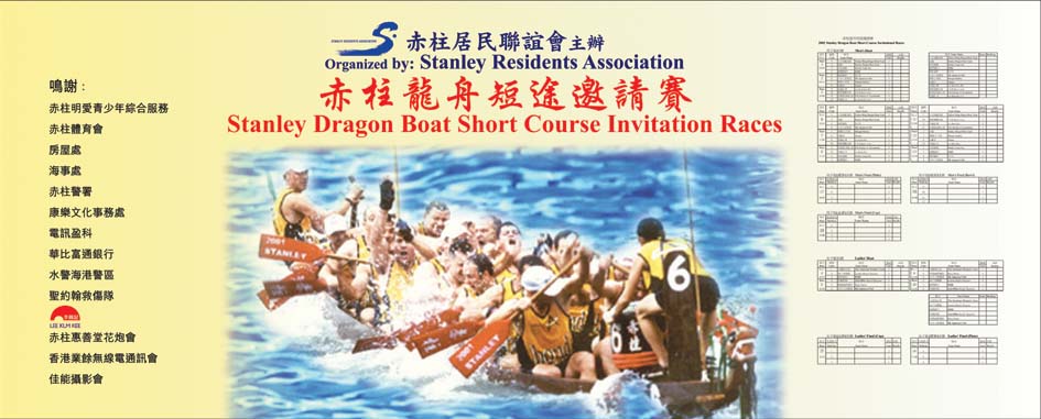 To promote tourism and the sport of dragonboating, the Stanley Residents Association will stage a Short Course Invitational Dragon Boat Races on Sunday 5th May, 2002. The organiser intentionally choose Stanley Bay ( in front of Murray House ) as the venue, and and invites martial arts troupes to perform a parade with a 150 feet (46 meter) large size dragon dance accompanied by several Chinese "lions " and a team of Chinese flags in Stanley Main Street to commemorate the Birthday of the fishermen's (patron saint) Goddess Tin Hau.