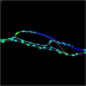 Pressure distribution graphs of the fluid during flow are very useful also. They show the regions of high and low pressure. Since all the fluid starts out at the same pressure and velocity, any changes mean that energy was used to make that change. The picture at the very top of this page is a pressure graph of a D-Fly in a flow. We are still studying hard on these pressure graphs to make use of them.