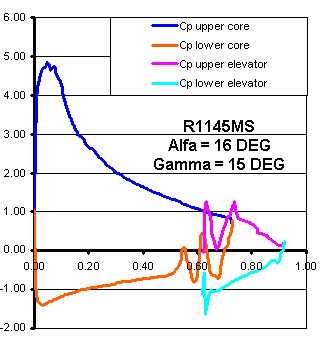 the curve for the same airfoil with a plane flap elevator. The R1145MS is
