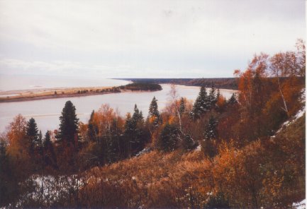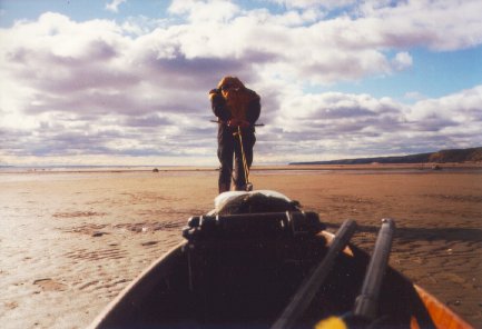 Le vent soufflait encore fort ce matin et j'ai eu bien de la difficulté à traverser l'embouchure de la rivière Manicouagan. Comme si ce n'étaient pas assez, je suis resté coincé sur un banc de sable à cause de la marée basse et j'ai ainsi du patauger pendant un bon moment. Tanné, je me suis arrêté à Baie Comeau pour m'acheter des bottes d'hiver, des mitaines, de l'enduit imperméabilisant pour ma tente, du combustible de camping et de la nourriture. J'ai du marcher environ dix km en tout, mais j'ai réussi à me procurer tout ce qu'il me fallait. Vers 13:30, je suis reparti, alors que le vent s'était affaibli et le soleil brillait. Je suis surtout content d'avoir des nouvelles mitaines imperméables en Gore-Tex que j'ai reçu gratuitement de la part de Chlorophylle, mon commanditaire pour les vêtements. Je peux finalement bénéficier de mains sèches et chaudes tout en gardant une bonne prise sur ma pagaie. L'après-midi ensoleillé a vraiment été agréable. Je me suis rendu jusqu'à Franquelin. (49o 17’N, 67o 53’O).