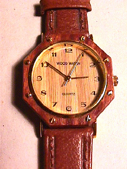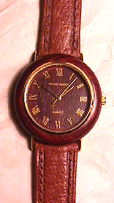 i mörkt, vackert träslag. Brun urtavla. Baksidan i
