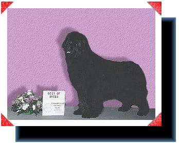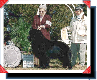 " This is me, Cyrus at the 1999 Newfoundland Club of America National Specialty. My handler here is one of my most favorite people, Helen Mancuso. Helen owns Boradaile Kennels, that's where my dad is from. "