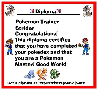 Welcome to The Pokemon Organization. This site is looking way better than the last design and layout. I am hoping that nore people will come to this site as it is to provide info on pokemon for all people of every age. Here you will find a lot of Pokemon information for all your pokemon needs. You can find codes and cheats, help on the pokemon games, and reviews of the latest and upcoming games. You'll see pictures of the new pokemon. That's not all. You can check out the episode guide to see if you missed any episodes (also contains upcoming pokemon episodes), summaries on the pokemon movies, a list of pokemon toys, and the ever growing popular card game. You can even get your own pokemon diploma (see below to see what it looks like). Explore the stuff you can see here and you will know you have come to the right place. Bookmark this page or if you don't like writing the long address, the shortone is http://striderspoke.cjb.net. Before you leave please take the time to sign the guestbook and see what wonderful comments we have gotten. Thanks for coming to The Pokemon Organization.