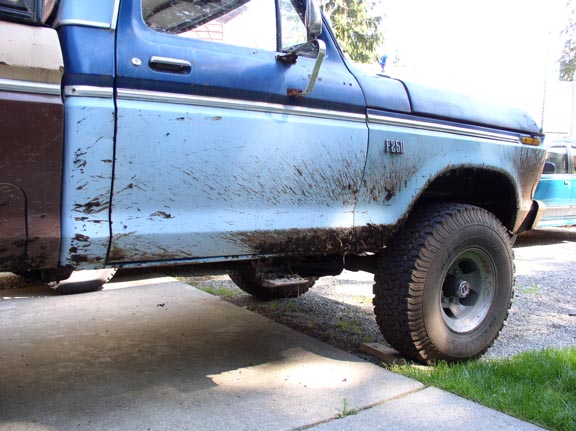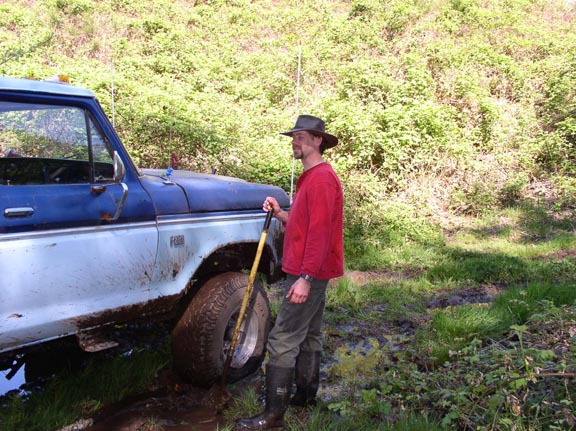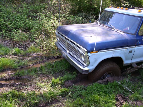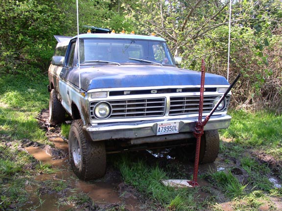 I didn’t have any wheelin’ gear in the truck, but had a cell. Called the wife and had her bring the Explorer. That didn’t get Hurc out alone. So we had to go to my house and get the Hi-Lift jack and a tow strap. The front end was sunk to the axle. I had to jack it up and fill the holes, then with a bit of a tug from the Explorer Hurc came right out.