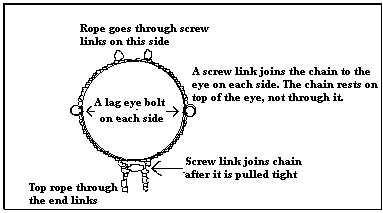 A few words about hardware store lag eye bolts. There is much temptation to simply screw a couple of them into the trunk and run the rope through them. This is not safe. The point where they will have the most stress is just under the wood, out of sight. Only use them to keep the chain in place, not to hold stress. In my system as the chain takes weight it cinches tight around the tree, placing only a fraction of the force on the eyes.