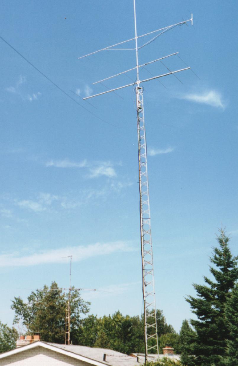 The antenna system at VE3FGU. HF antennas are a full wave delta loop for 80 metres, 160 metre inverted vee and a 4