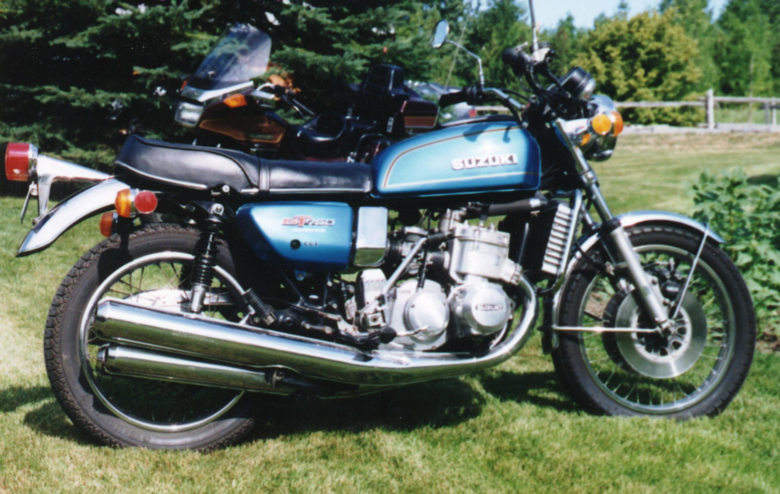 This is our previous motorcycle, a Suzuki GT750, which we bought new in 1976.