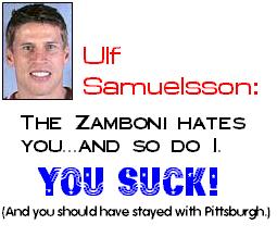 Human error is understandably the most common contributor the Zamboni accidents. But early in the season of 1990, Ulf Samuelsson skated over the line. Playing for the Hartford Whalers in a game against the Toronto Maple Leafs, Samuelsson was assessed a penalty for fight instigating (unsportsmanlike conduct) and threw a frenzy in the penalty box, throwing anything he could get his hands on. He was then given a game misconduct, sending him to the showers. An irate Sameulsson started up the runway, still looking for something to take his frustration out on. Sitting outside was the poor Zamboni, innocent and helpless, with a huge bull's-eye on it. Samuelsson grabbed a squeegee, smashed the grill of the machine, and continued down the tunnel. Fans and players were outraged, and he was fined a whopping $500 ($300 of which when towards the repair of the machine). Zamboni drivers continue to show their appreciation by giving him the one-finger salute whenever possible. But the Zamboni has gotten its revenge, too.