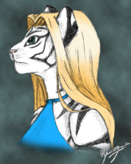 Occupation: Bard/Singer/Tavern worker with a little adventuring on the sideAge: 19 Height: 5'8" {in human form}; 6'3" {in weretiger form}; 3' tall, 6'3" long (9'4" with tail) {in full tiger form} Weight: 135 lbs (human); 164 lbs (weretiger); 443 lbs (tiger) Appearance: a tall, beautiful young woman with straight pale blonde hair reaching her waist and sparkling blue-green eyes. She moves with cat-like grace and fluidity. In weretiger form her iris dialates to the full size of her eye and she is covered in soft white fur with stipes of coal. A three foot tail extends from the base of her spine and there are retractable claws on her toes and fingers. Her feet take on a cat-like build and she walks on her toes. She prefers to go shoeless and wear clothing of light materials that don't restrict movement or her transformations (not to mention look good on her when she's on stage singing ^_^). However, when on adventures she occasionally dresses for the part, turning to heavy clothes and peices of leather armor.