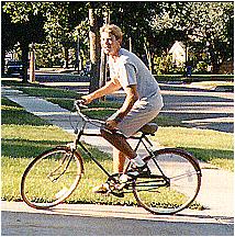 September 26 - 30 (2000) was quite a month for the small town of Sparta Wisconsin. This particular town was chosen as a summer destination for Robbie Tomlin. This0 trip included visits to such sites as an okra patch, the Sparta tunnel & the Sparta Park for the annual Cordner Family reunion. Robbie talked to several residents as well as city officials in his third visit to the town. Robbie said that his cousin, Jill Cordner, and he went to see two movies (Scary Movie & What Lies Beneath) while on his trip. Jill and Robbie went to La Crosse for both of these endeavors. Robbie grew extremely close with his family during this short visit. He flew Northwest Airlink and ate peanuts on his way to La Crosse. In the above picture, Robbie is scene riding a bike through the town of Sparta (Bike riding is one of his favorites on trips).