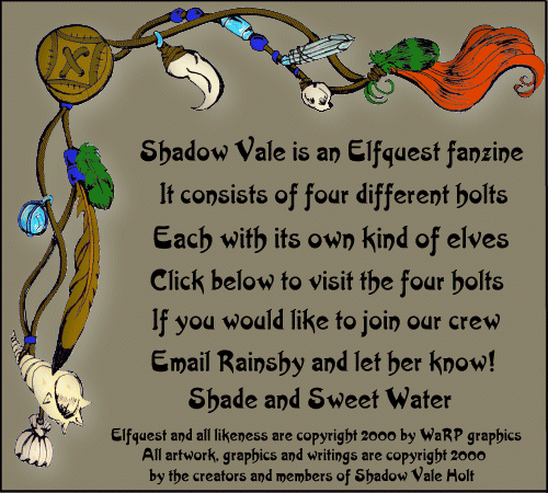 1.) First of all, PLAY FAIR! Each character belongs to someone here. This means that if you did not create him/her, you must get permission from their owner to use them in a story. Be sure when you use their character to get their input. Some people do get very frustrated when you misuse their characters. So please follow this one! 2.) Stories. All stories must be typed and able to be edited/changed to help the flow of the story lines and use of characters. No one is allowed to kill off a character without the permission of the Holt Leader and/or person who decided to get rid of that character. Stories must be at least a page and a half long to as many as you can whip out. 3.) Artwork/Illustrations. All artwork must be inked by the person who drew the picture. Please send the creators a copy as well as the Holt Leader. Pencil drawings will only be accepted if we can get a good clean copy when we take it to the printers. Artwork can be send over the computer, however the same rule applies, if we can not get a good clean copy, we will ask you to please snail mail us a copy. Artwork for stories can be requested by a certain artist, however this is not a guarantee. Please remember that all if not most of our artist has another life outside of the Holts and needs time for that as well! 4.) No Super Elves! Please remember that this is Elfquest, not D&D or Superman. None of the elves will ever have x-ray vision or can bend steel or melt ice with fire from their eyes. It is true that some of our Eyrians and some of the older Ancient Elves like Lothlorian or Nightwish have some Super Powers, however they are also over 10,000+ and are High Ones. The younger generations lost their abilities with each new birth. Unless your elf is an Eyrian, any elf who’s creator deems that they just have to have a talent, must get them approved by the Holt Leader. We also ask that you please limit your elves with abilities to 1 in 8 elves. If a talent becomes available, like a healer dies, then we will have a bid on the talent. 5.) No Gay or Bi-sexual elves mentioned. There are plenty of Holts out there with these types of elves and can accommodate those who have to have one. We have placed this rule not because we are prejudice or homophobic but rather because of how the original EQ was. Until the Wavedancer series, nothing was ever mentioned about same sex relationships. AND IF it was, it was done so tastefully that no one noticed. Fifteen Years ago, when we set this holt up, it was just starting and we decided against it. Most of those who have gay or bi-sexual elves only have them so they can draw or write about them in sexual situations. I am sorry, but we have 7 members in this holt right now who range from 14-17, and though it may be true that they know what it is, I do not want their parents attacking me. I have had it happen, and I will not have it happen again. We have several members who are gay and bi-sexual in real life and they agreed with this rule and it’s funny that most of those who want these types of elves are not them. This rule will not bend or change ever. Thanks for understanding. 6.) Another thing about Talents. If the talent is not listed in the Elfquest Big Gatherum, It will not be permitted in this holt. No x-ray vision, no super sonic speeds, no mutants, etc. If it has happened in the EQ books, then it will be acceptable if we need that particular talent. 7.) Nudity. I agree that if an artist can draw a picture with carefully shaded areas, a partial nudity can be submitted in the newsletter. We have done this before and will do it again, however if it is done with full frontal, I will have to contact the parents of the younger members and get their ok to send their child a newsletter. Most of the time this is ok’d by the parent. I just want to make sure that no one gets hurt. This Holt has been around longer than most of the others out there, and I would like to pass it on to my daughter when she is ready. |