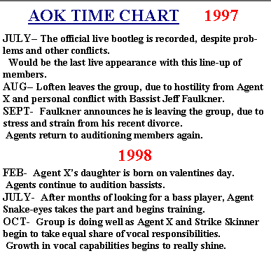 JAN- AOK prepares to enter studio in mid February. FEB- AOK enters studio and records three acoustical songs. MAR- Agent X loses his friend and companion Kerry Watters to heart failure. Group bands together and waits out the trajedy, shutting down temporarily. APRIL- X does not return to rehearsal until late in the month, overwhelmed by his position. Due to finances recording project is scrubbed. MAY- Agent X is created, as he first emerges in black leathers and mask for first time. JUNE- Group begins working on other Agent identities. APRIL- Snake-Eyes and Strike Skinner emerge in the flesh.