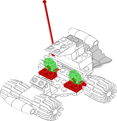 The Space Police Moon Buggy is used when conventional land cruisers come across difficult terrain. The Moon Buggy's Wheels can wade through dust up to a foot deep, and cross nearly any rocky surface at speeds up to 200 kph. This is extrememly helpful on desert planets, or stale moon colonies, where officers of the law may not be readily available to keep the peace.