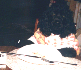 Here I am... (a little disheveled) Just got back from a walk with Dad and now its snack time.. Nothin like a little pizza to make me a happy person uh er dog I mean. Heheheh. |